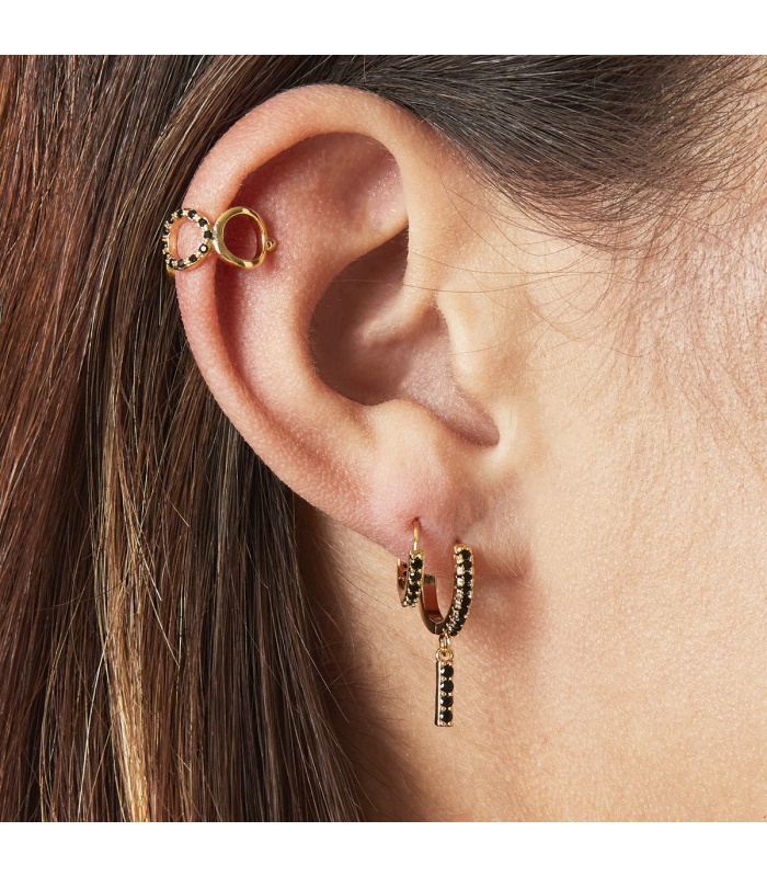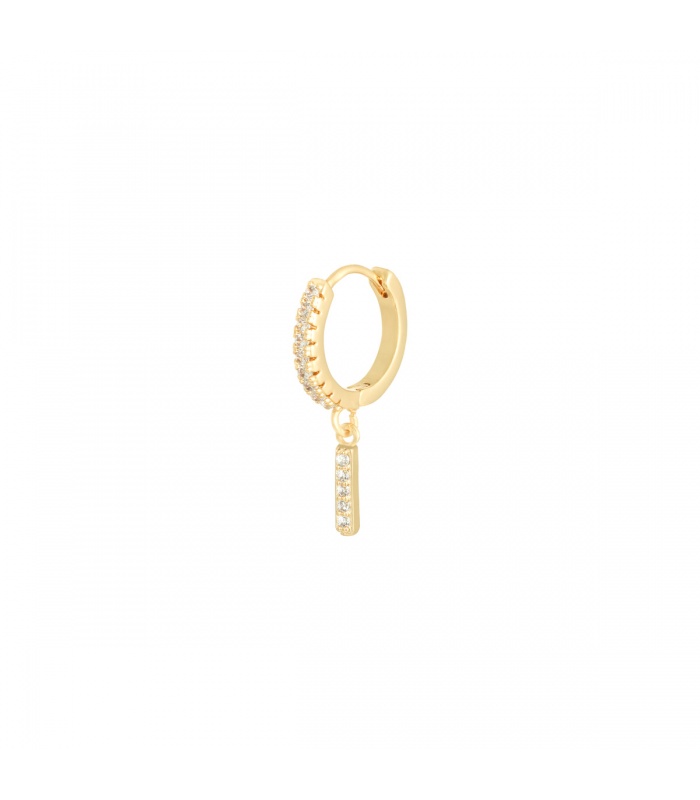 Goudkleurige oorbel met zilverkleurige steentjes en hanger met de letter I.