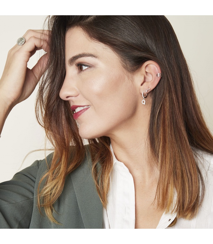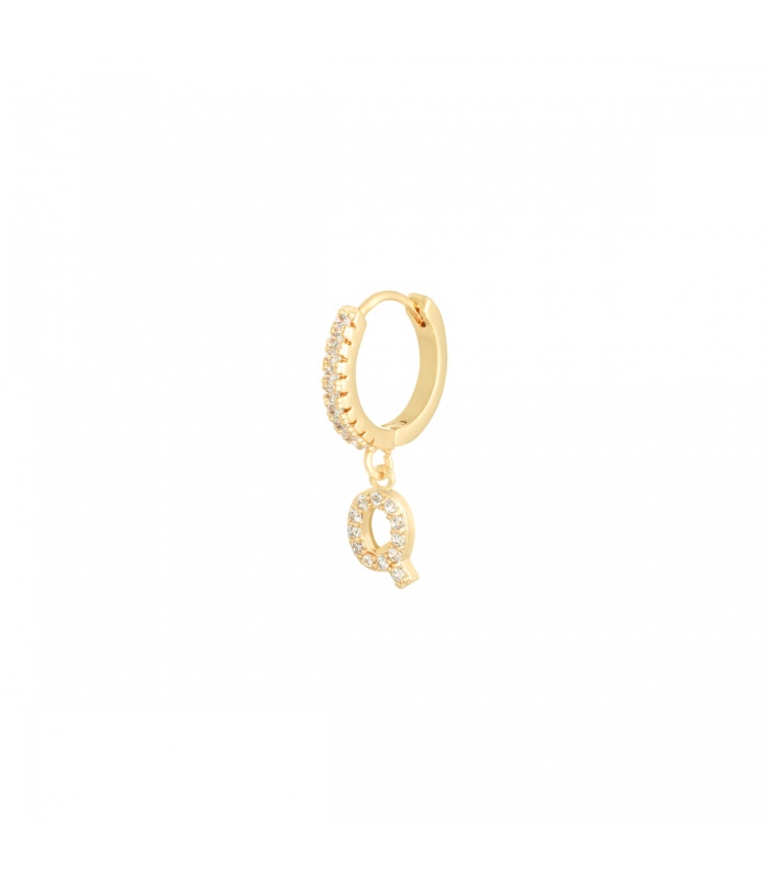 Goudkleurige oorbel met zilverkleurige steentjes en hanger met de letter Q