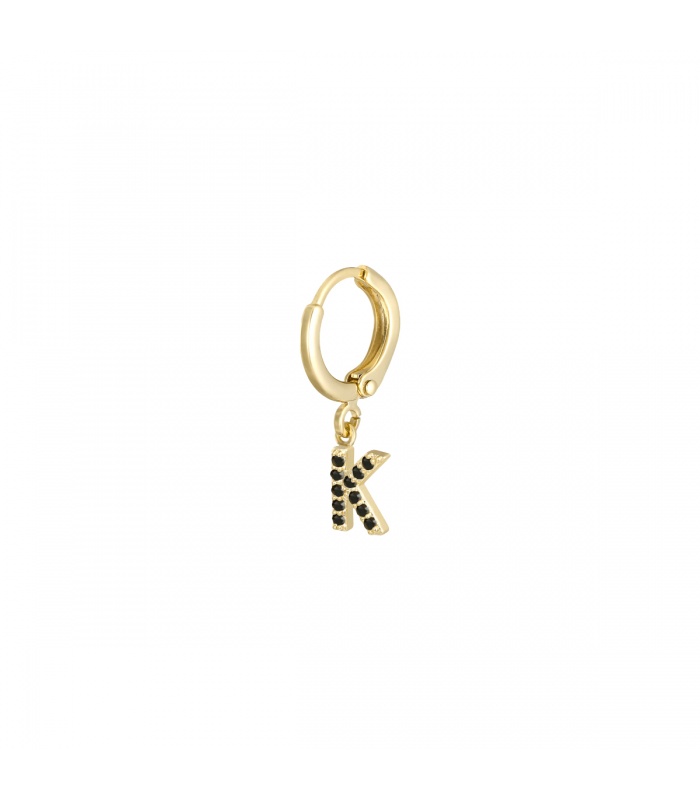 Goudkleurige oorbel met zwarte zirkonia steentjes en initiaal K