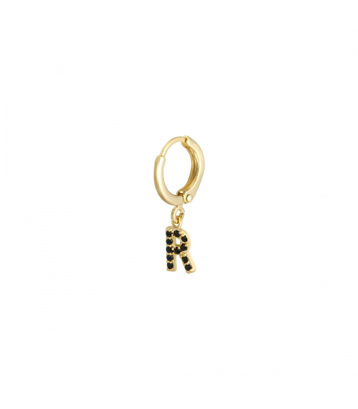 Goudkleurige oorbel met zwarte zirkonia steentjes en initiaal R