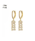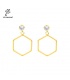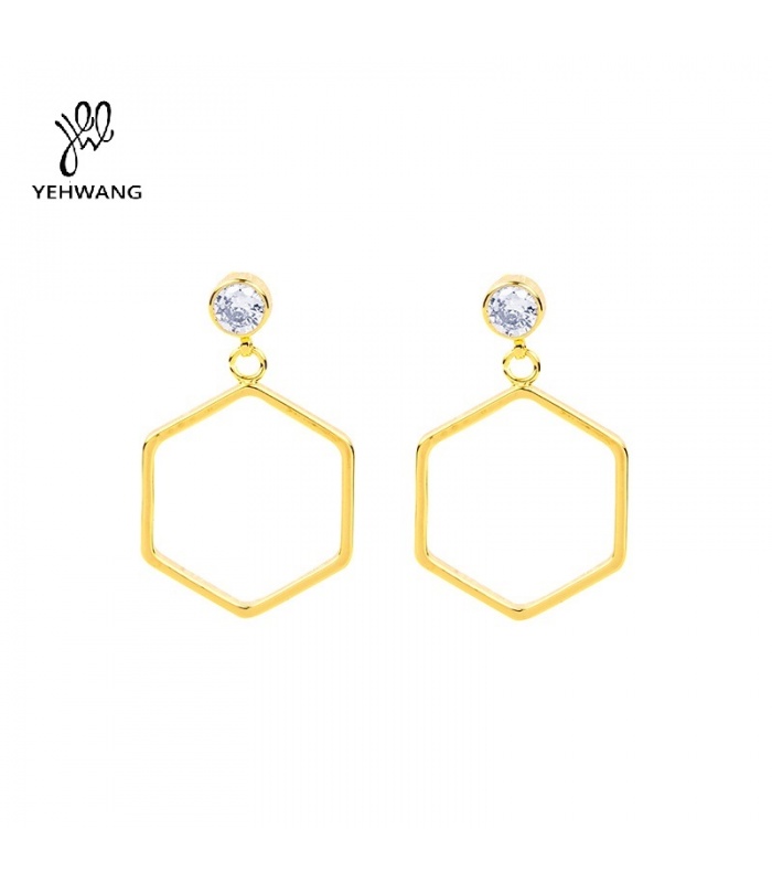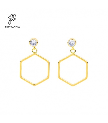 Goudkleurige oorbellen met een 6 hoekige hanger en helder strass steentje op de steker.