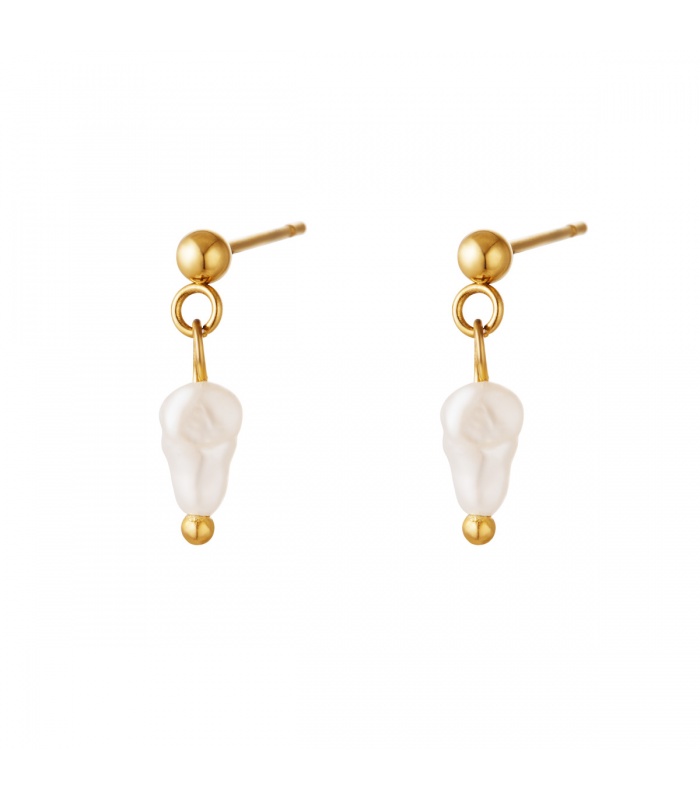 Goudkleurige oorbellen met hangende zoetwaterparel.