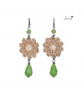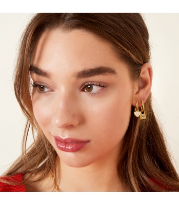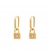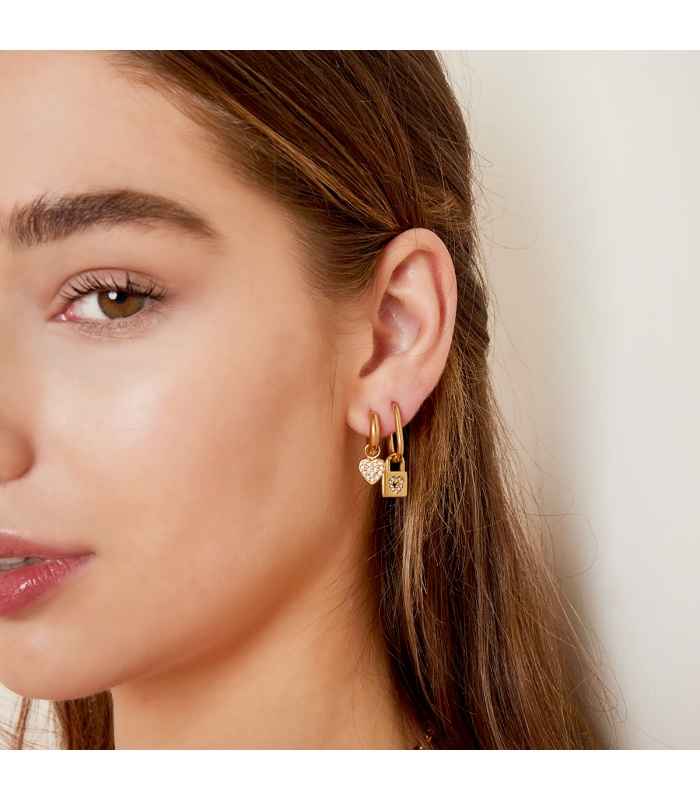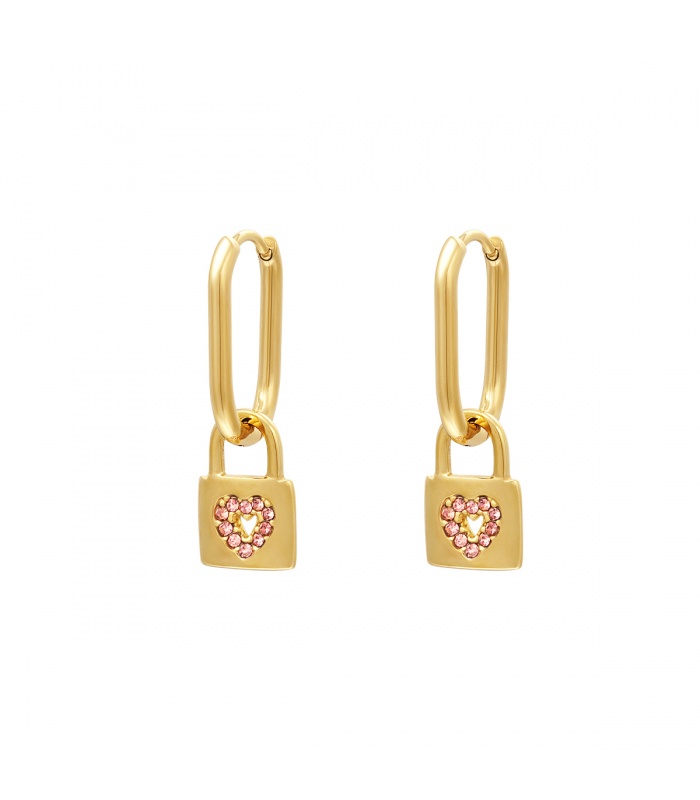 Goudkleurige oorbellen met hangslot en roze zirkoonsteentjes.