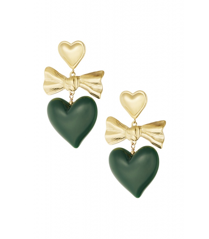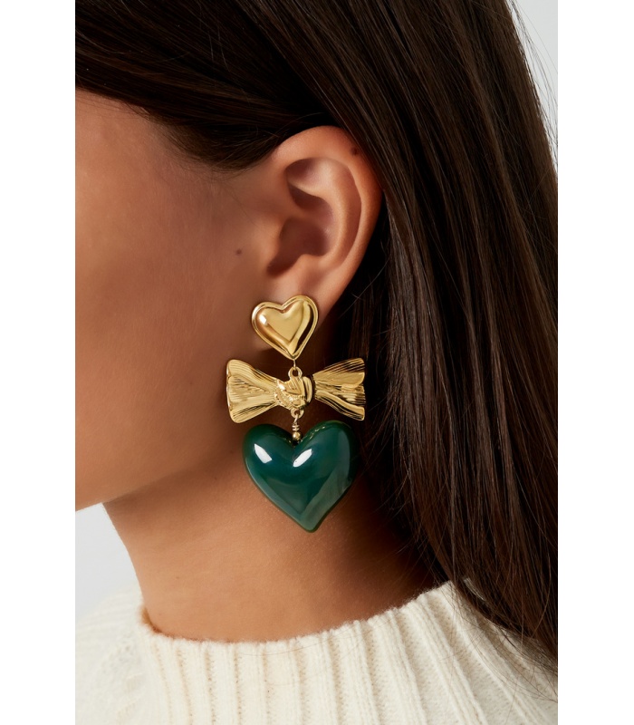 Deze goudkleurige oorbellen met een speelse strik en een stijlvol groen hartje als hanger stralen verfijnde charme uit. De combinatie van de zachte gouden glans met het diepgroene hart zorgt voor een opvallend maar elegant effect. Geef jouw sieradencollectie een frisse upgrade en bestel vandaag nog!