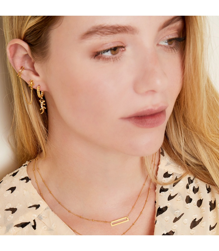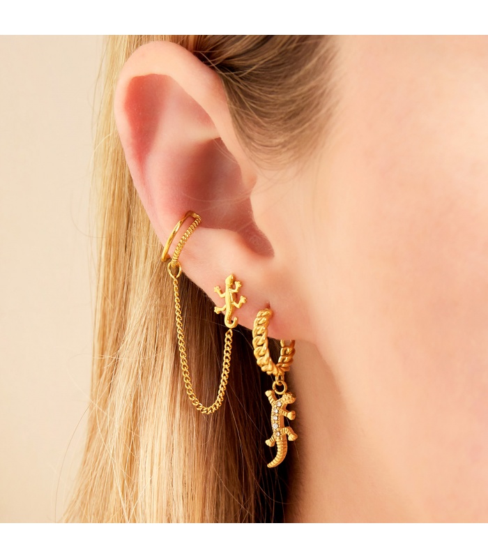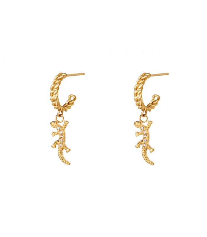 Goudkleurige oorbellen van kleine schakeltjes en een salamander bedel als hanger.