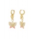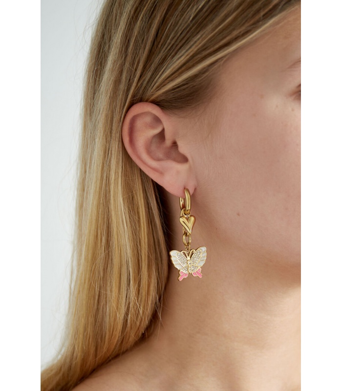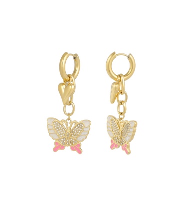 Verwen jezelf met deze betoverende goudkleurige oorhangers, versierd met delicate bedels in de vorm van een vlinder en een hartje. Deze charmante oorbellen stralen elegantie uit en zijn perfect om een vleugje romantiek toe te voegen aan je look.