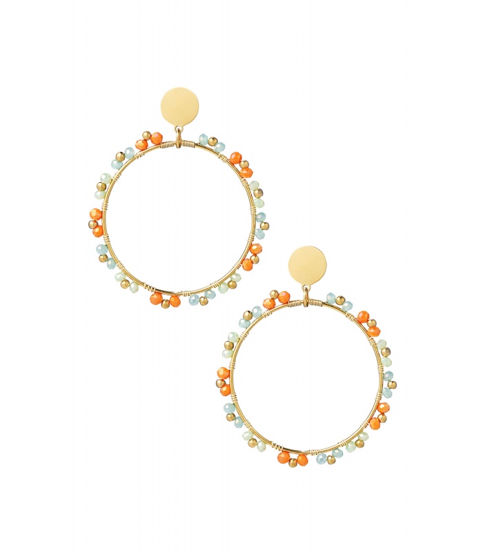 Bestel Nu je Goudkleurige Oorhangers met Blauw en Oranje Kraaltjes