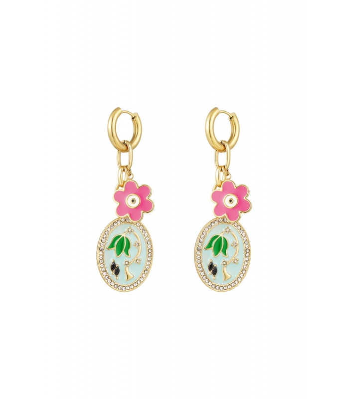 Goudkleurige oorhangers met een groene bedel en een roze bloemetje