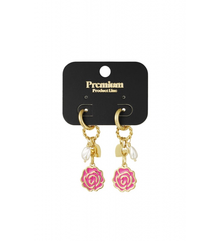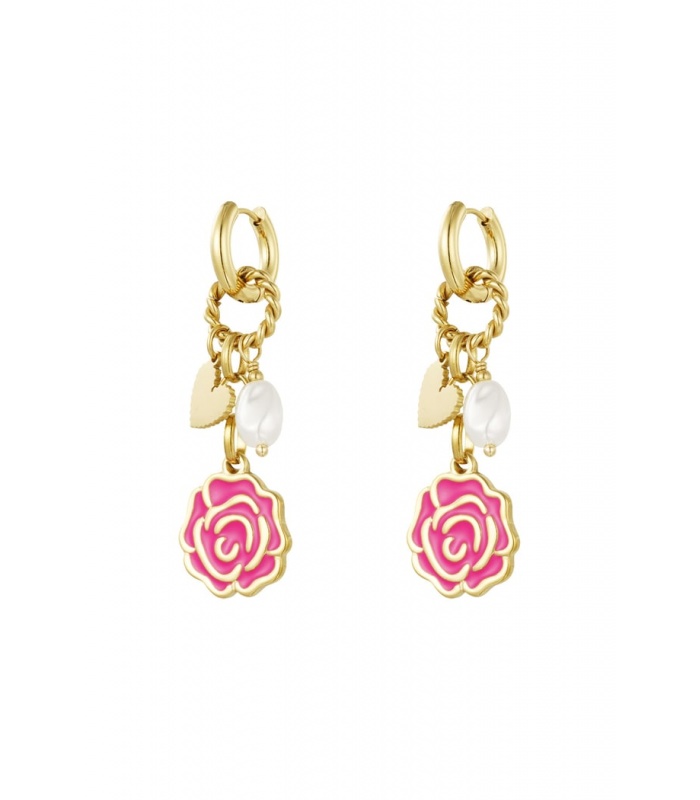 Deze goudkleurige oorbellen combineren een roze bloemen bedel, een hartje en een glanzende acrylparel voor een romantische uitstraling. Ideaal om je dagelijkse look op te fleuren of een speciale gelegenheid extra glans te geven.