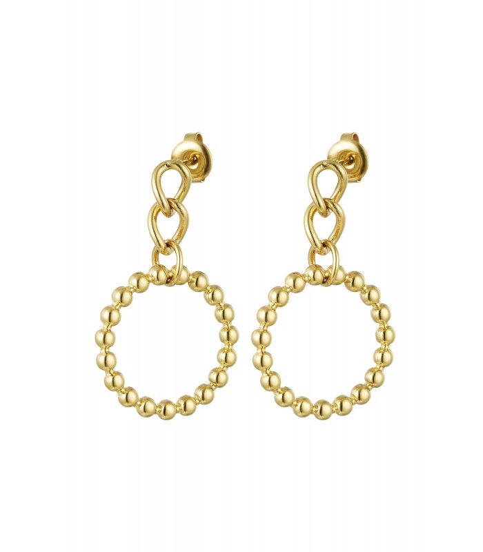 Goudkleurige oorhangers met een schakel ketting en een cirkel met bolletjes.