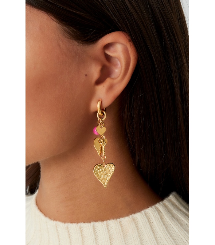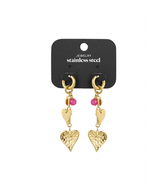 Deze elegante goudkleurige oorhangers combineren romantiek en stijl dankzij de roze kralen en sierlijke harten bedels. Het ontwerp is zowel speels als chic, ideaal om je outfit een extra vleugje glamour te geven. Door de hoogwaardige afwerking blijven de oorbellen mooi, terwijl de gouden tint en de roze accenten zorgen voor een warme uitstraling.