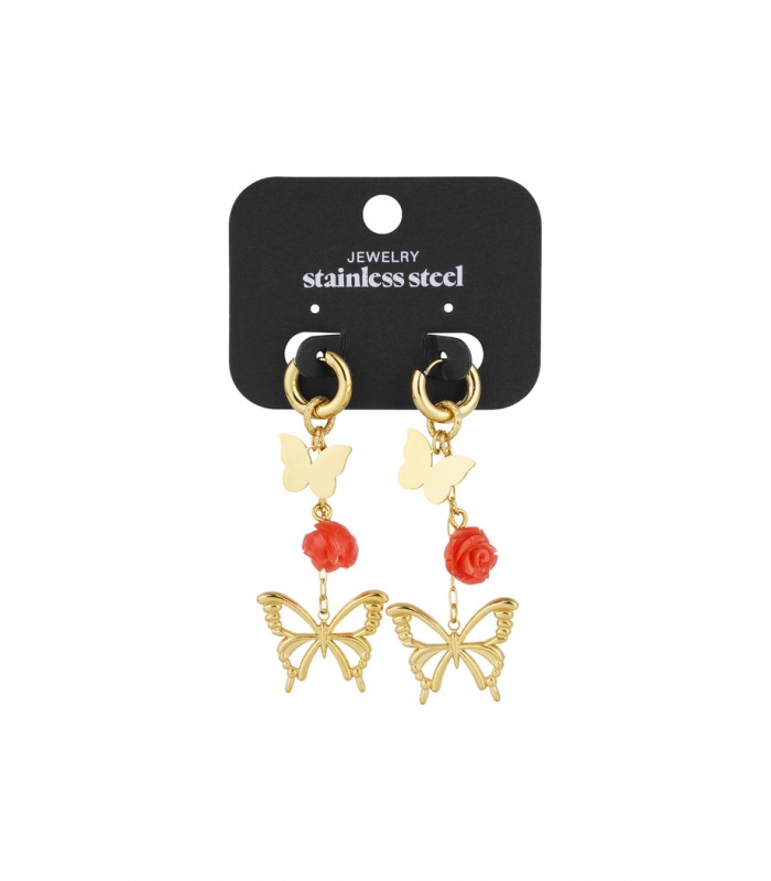 Deze goudkleurige oorhangers combineren sierlijke vlinders met een opvallend rood roosje als bedel. Het elegante ontwerp voegt een vleugje romantiek toe aan elke outfit. Perfect voor zowel dagelijkse draagmomenten als speciale gelegenheden.