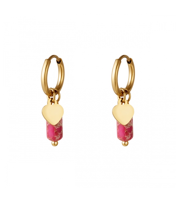 Goudkleurige oorringen met een hart als bedel en een roze steen.