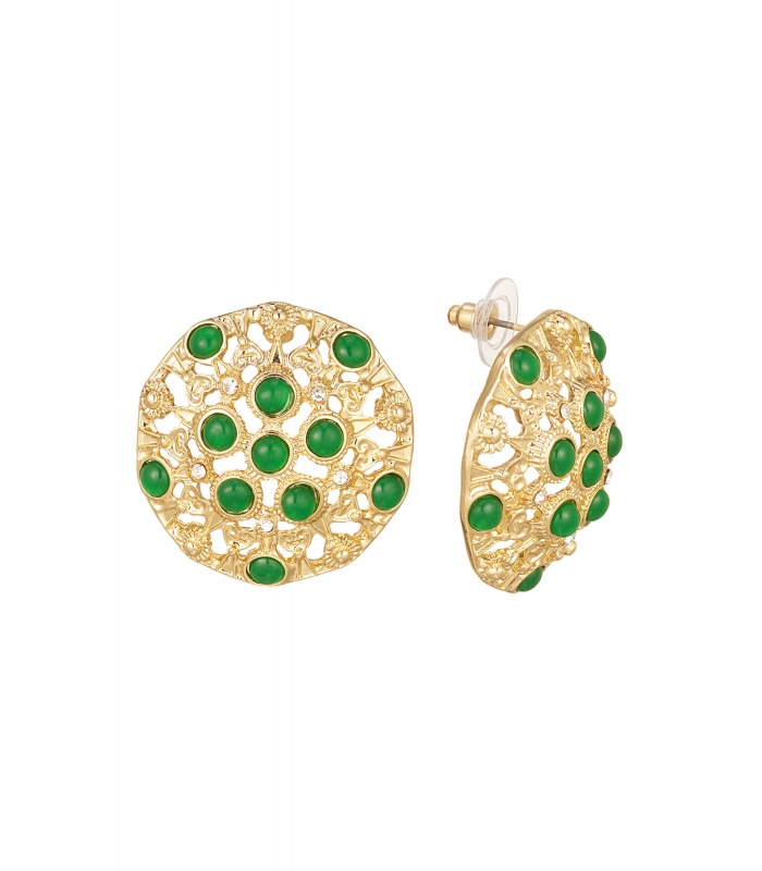 Goudkleurige open gewerkte oorhangers met groene steentjes