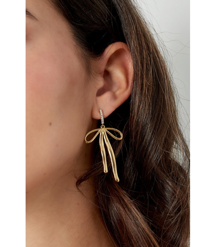 De combinatie van een goudkleurige strik en heldere strass steentjes zorgt voor een tijdloze en modieuze uitstraling. Deze oorbellen passen perfect bij diverse stijlen en gelegenheden, waardoor ze een veelzijdige aanvulling zijn op je sieradencollectie.