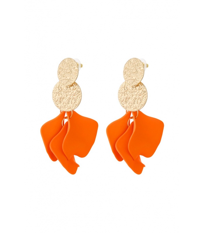 Deze stijlvolle oorbellen combineren levendig oranje met goudkleurige details, wat zorgt voor een warme en elegante uitstraling. Het tijdloze ontwerp maakt ze perfect voor zowel dagelijkse outfits als speciale gelegenheden.