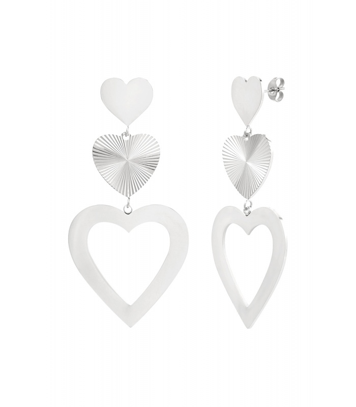 Met een zilverkleurige afwerking die subtiel licht vangt, zijn deze oorhangers een blikvanger die je look een vleugje tijdloze elegantie geven. De drie hartvormige hangers vertegenwoordigen een reeks betekenissen - liefde voor jezelf, liefde voor anderen en de liefde voor momenten die je koestert. Een symbool van verbinding en emotie die je met trots kunt dragen.