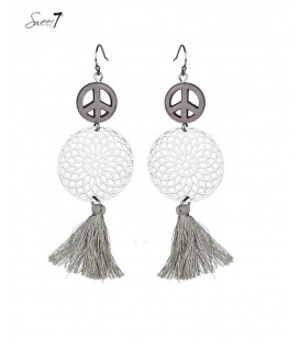 Zilverkleurige oorhangers met een grijze peace teken en kwast. De lengte van deze oorbel is circa 8 cm. Voor oren met gaatjes. De oorbellen zijn nikkelvrij. De oorbellen zijn voorzien van stoppertjes.
