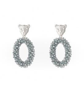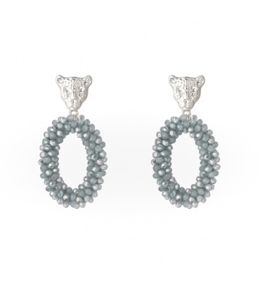 Grijze oorbellen met een panterkop en handgeregen kralen
