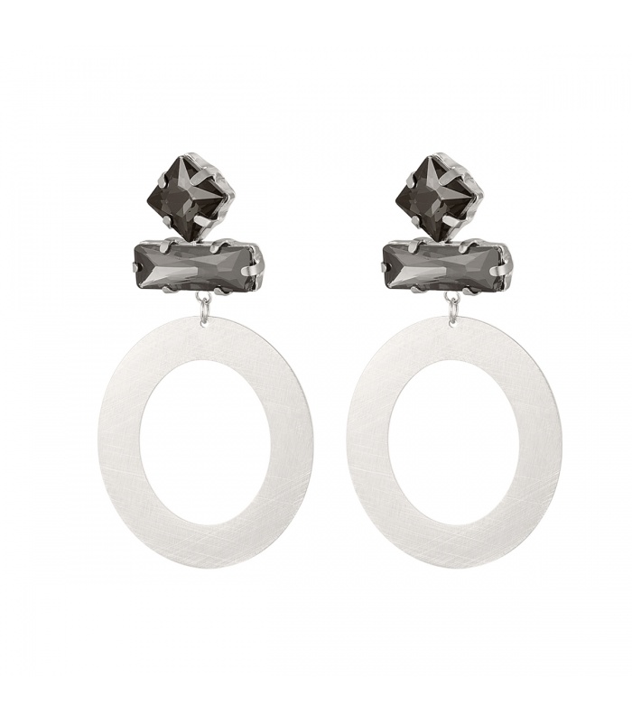 Zilverkleurige ronde oorhangers met 2 grijze glas steentjes.