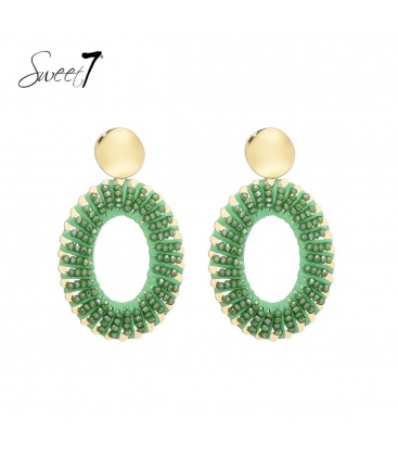 Voeg een vleugje boho chic toe aan je look met deze prachtige goudkleurige oorhangers met groene glaskralen en raffia van het trendy merk Sweet7.