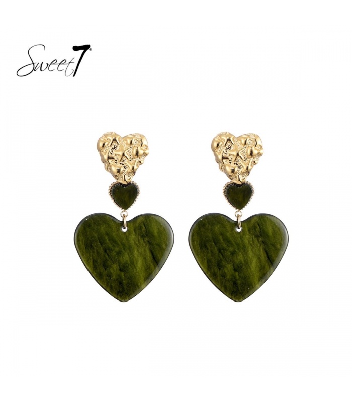 Wil je romantiek combineren met een krachtige uitstraling? Deze oorbellen van Sweet7 hebben een speelse hartvorm in diep mosgroen, aangevuld met een goudkleurige bovenkant vol reliëf. De mix van structuren en kleuren maakt dit een echte blikvanger.