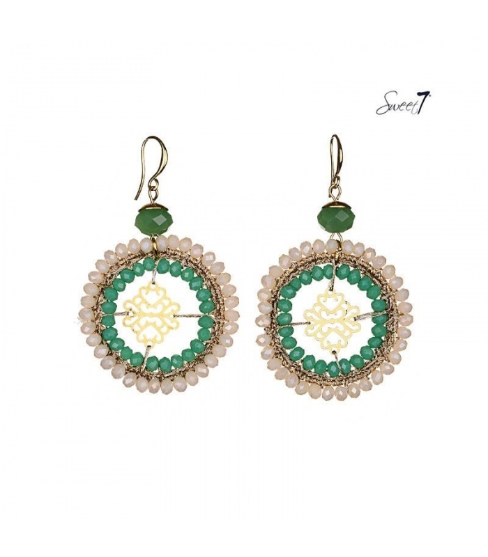 Groene met creme kralen oorhangers en een goudkleurige bedel met koord.