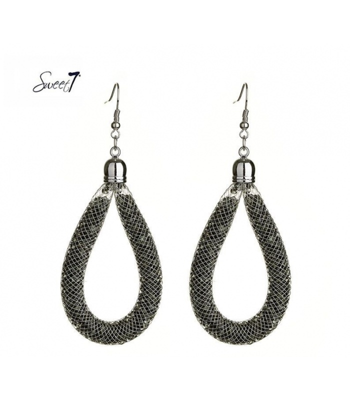 Oorhangers met ovale hanger van nylon mesh met daarin kleine donker groene kunststof glitter steentjes.