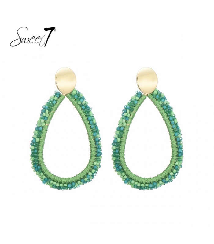 Voeg een vleugje natuurlijke schoonheid toe aan je look met deze prachtige groene oorhangers met kralen en koord en een goudkleurig oorstukje van het modieuze merk Sweet 7.