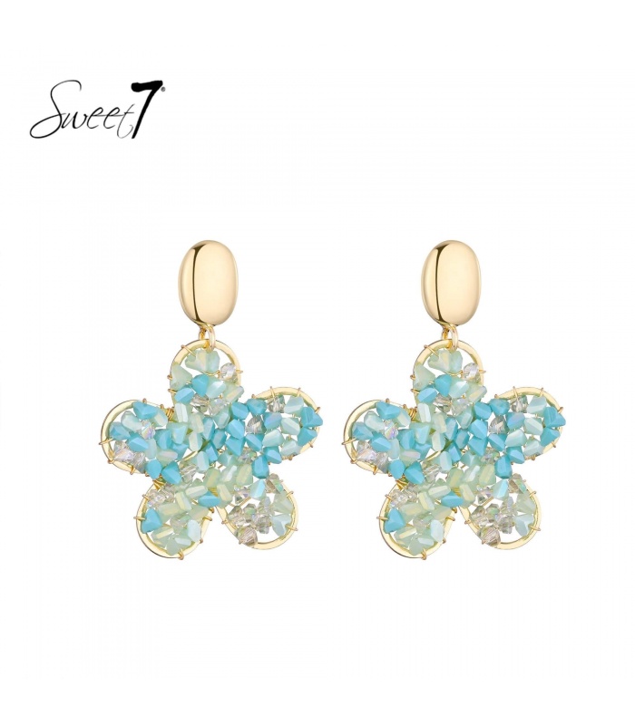 Hoe breng je het frisse gevoel van een lentedag naar je look? Deze speelse oorbellen van Sweet7 vangen dat gevoel perfect. De bloemvorm is opgebouwd uit een mix van turquoise, opaalwit en transparante steentjes, die samen een sprankelend geheel vormen. Licht, vrolijk en onweerstaanbaar charmant.