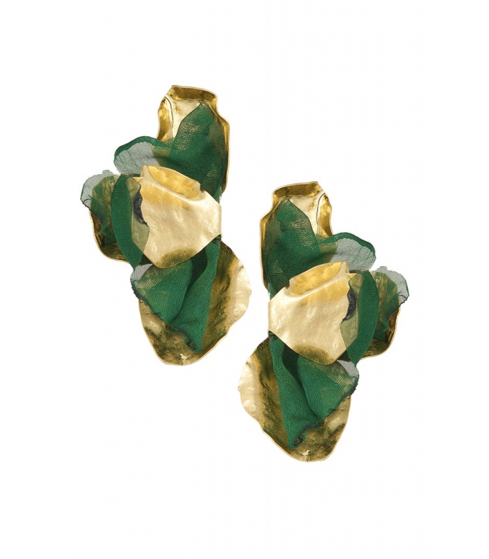 Deze goudkleurige oorhangers met groene stofdetails zijn een opvallende mix van elegantie en speelsheid. De combinatie van de glanzende gouden afwerking met de zachte groene stof creëert een prachtig contrast dat direct in het oog springt.