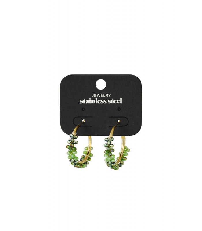 Goudkleurige oorringen met groene glassteentjes voegen een levendig accent toe aan je look. Deze oorbellen combineren een warme goudtint met een frisse groene glans, waardoor ze perfect zijn voor zowel casual als feestelijke gelegenheden. De glassteentjes reflecteren het licht en creëren een speels en elegant effect.