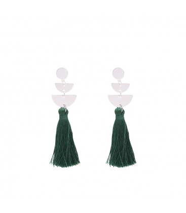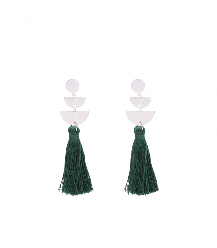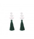 Zilverkleurige oorhangers met verschillende elementen en een groene kwast.