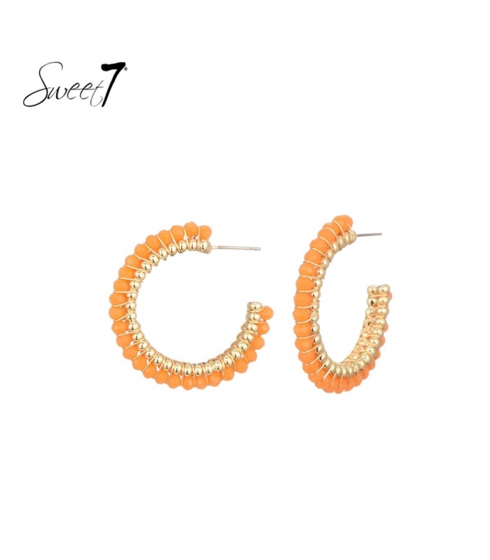 Goudkleurige oorringen met oranje glas kralen.