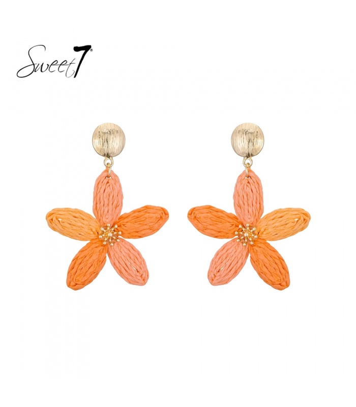 Deze Sweet7 oorbellen zijn een echte ode aan zomerse elegantie. De opvallende bloemvorm, opgebouwd uit vijf verfijnde bloemblaadjes in een warme perzik-oranje tint, geeft de oorbel een speelse maar stijlvolle uitstraling. De licht gekreukte textuur van de blaadjes zorgt voor diepte en een ambachtelijk karakter, alsof elke bloem met de hand is gevormd.
