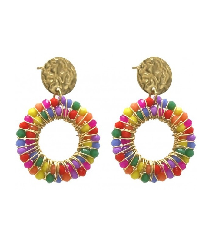 Gekleurde glas kralen oorhangers met een goudkleurig oorstukje.