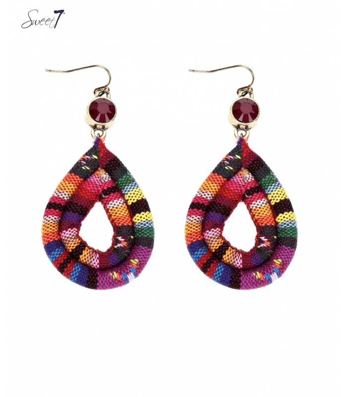 Gekleurde oorhangers met een hanger van stof en een rood steentje.