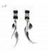 Gekleurde oorhangers met groene kraaltjes en grijze veren.