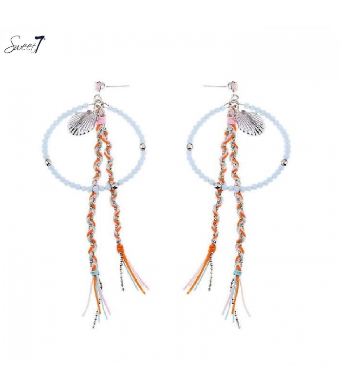 Gekleurde oorhangers met metalen schelp en gevlochten kwasten.