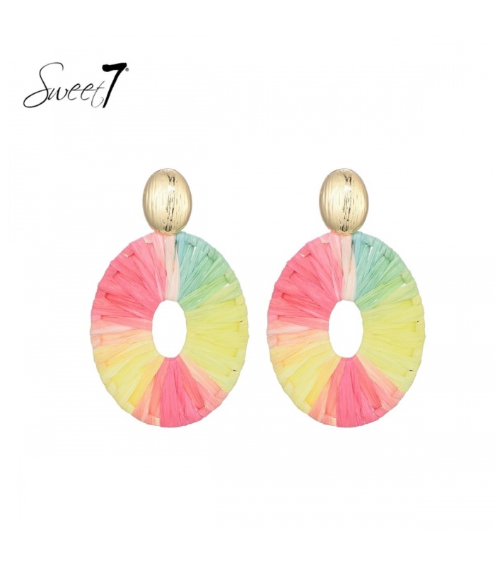 Gekleurde raffia oorhangers met een goudkleurig oor stukje.