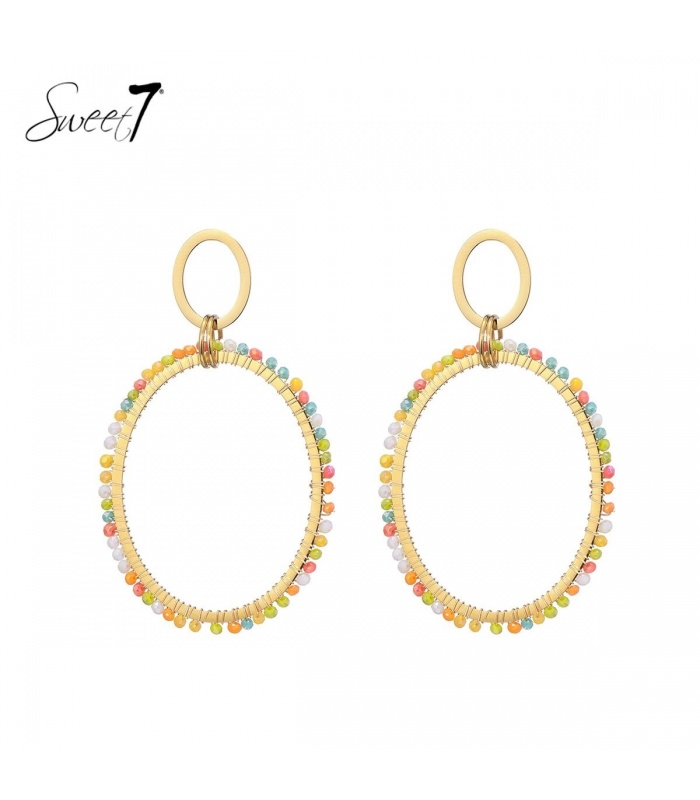 Goudkleurige oorhangers met gekleurde kraaltjes.