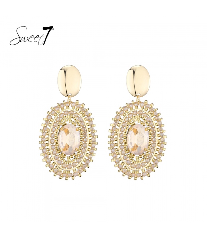 Hoe vang je pure elegantie in een accessoire? Deze ovaalvormige oorbellen met facetgeslepen steen zijn het antwoord. De zachte champagnekleur schittert subtiel en wordt omlijst door fijne kraaltjes in goudtinten. Een tijdloos design dat licht vangt en elke beweging accentueert. Perfect voor een diner, feest of een stijlvolle werkdag.