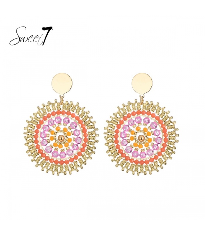 Deze kleurrijke oorbellen van Sweet7 vangen het gevoel van een zwoele zomeravond in een ontwerp. Met een cirkelvormig patroon vol koraal roze, zonnig geel en sprankelend lila straalt elke oorbel als een kleine zon. Perfect voor wie houdt van statement sieraden met een boho touch en kleur.
