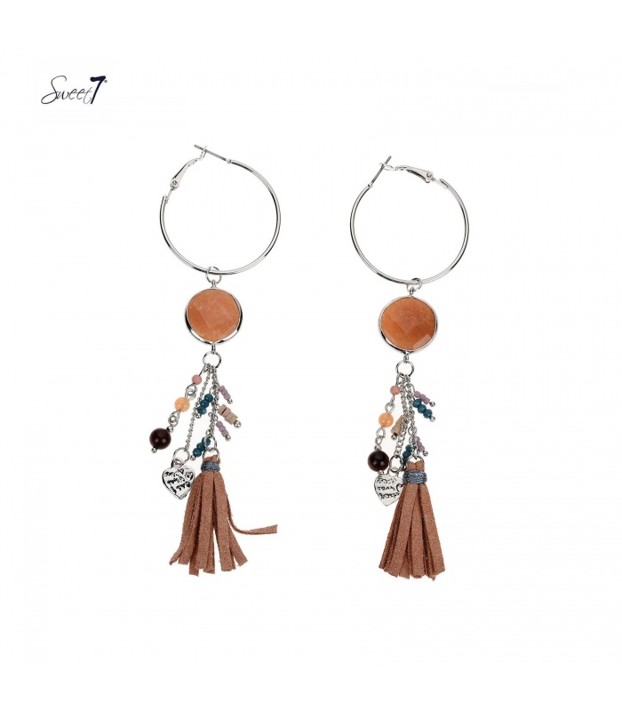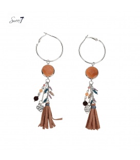 Zilverkleurige oorringen met bedels, kralen en bruine kwasten.