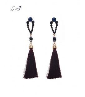 Donker rood paarse oorhangers met kwast en paars blauwe strass steentjes.