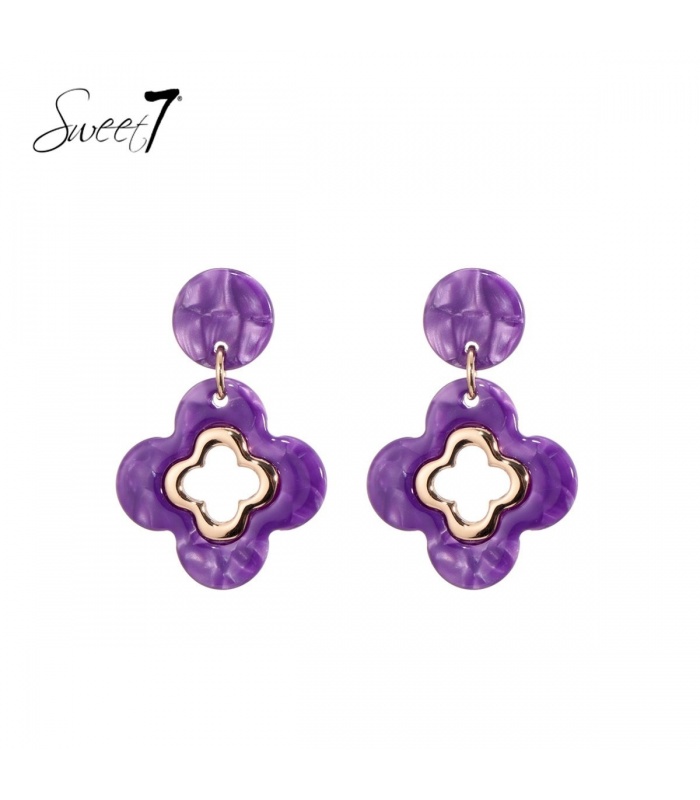 Paarse klaver vier oorhangers met een goudkleurige rand in het midden