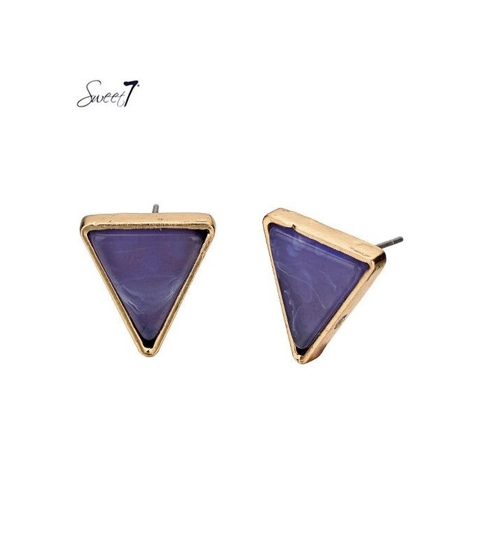 Paarse oorbellen in de vorm van een driehoek en een goudkleurige rand.