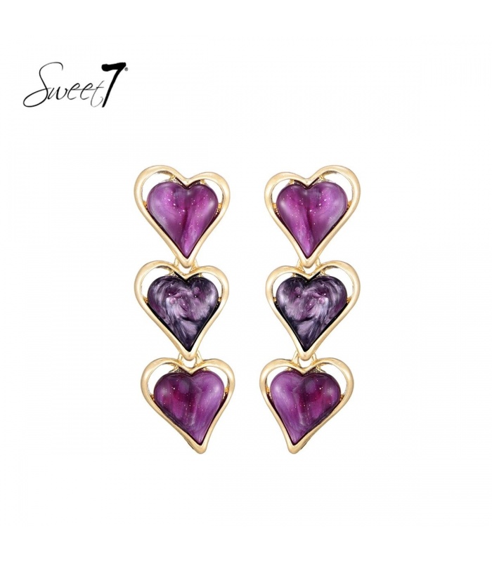 Dankzij het marmer effect in het middelste hart ontstaat er een speels en uniek patroon. Deze oorbellen passen perfect bij trends als paarse oorbellen en statement oorbellen dames. Combineer ze met een eenvoudige top of juist met een feestjurk voor extra flair.