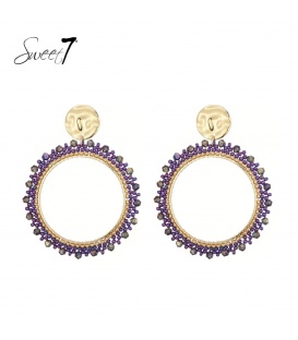 Paarse oorhangers van glaskralen en een goudkleurig oorstukje
