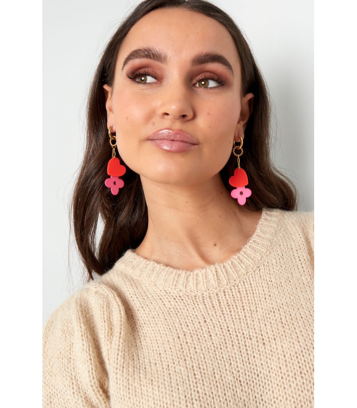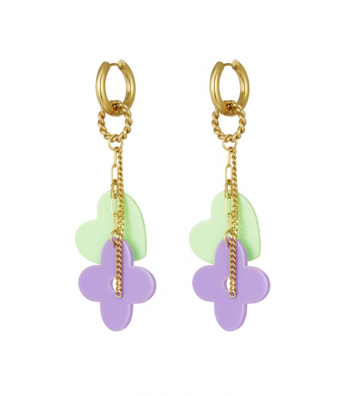 Goudkleurige oorhangers met een groen hart en een paarse bloem
